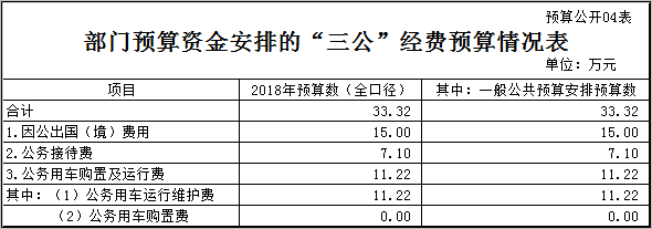 2018年部门预算共安排“三公”经费支出预算33.32万元(全口径),其中:因公出国(境)经费支出预算15万元,公务接待费支出预算7.10万元,公务用车购置及运行费11.22万元,其中:公务用车运行维护费11.22万元,公务用车购置费为零。