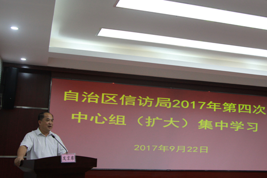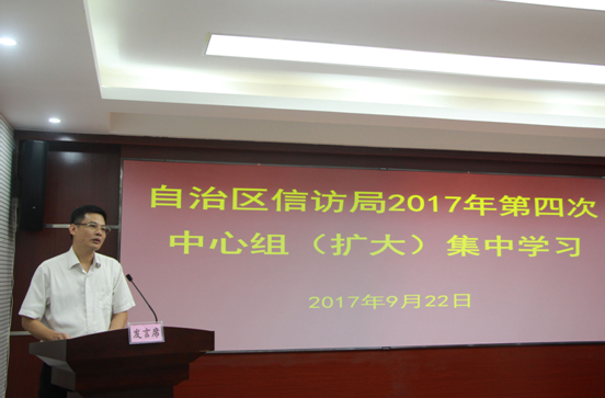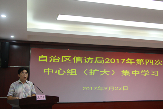 2017年9月22日上午,自治区信访局组织理论中心组开展2017年第四次集中学习,对《关于县以上党和国家机关党员领导干部民主生活会的若干规定》《中国共产党巡视条例》《中国共产党工作机关条例(试行)》《中共中央办公厅 国务院办公厅印发<关于进一步加强信访法制化建设的意见>的通知》以及中央关于意识形态工作的重大部署和基本要求等5项内容进行了深入的学习,并传达了全国社会治安综合治理表彰大会和全国信访局长会议精神。卢万兵局长主持会议并做了重要讲话,中心组成员结合相关学习专题做了重点发言,全局干部职工和聘用人员参加了学习。