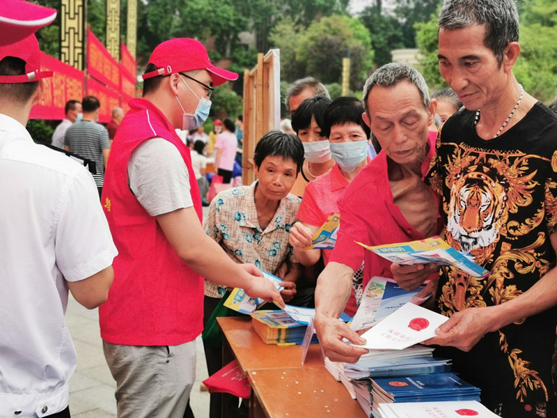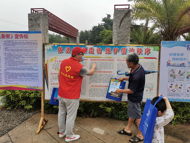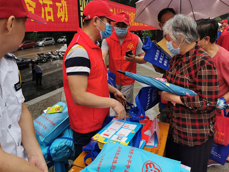 图为工作人员向群众发放信访宣传资料
