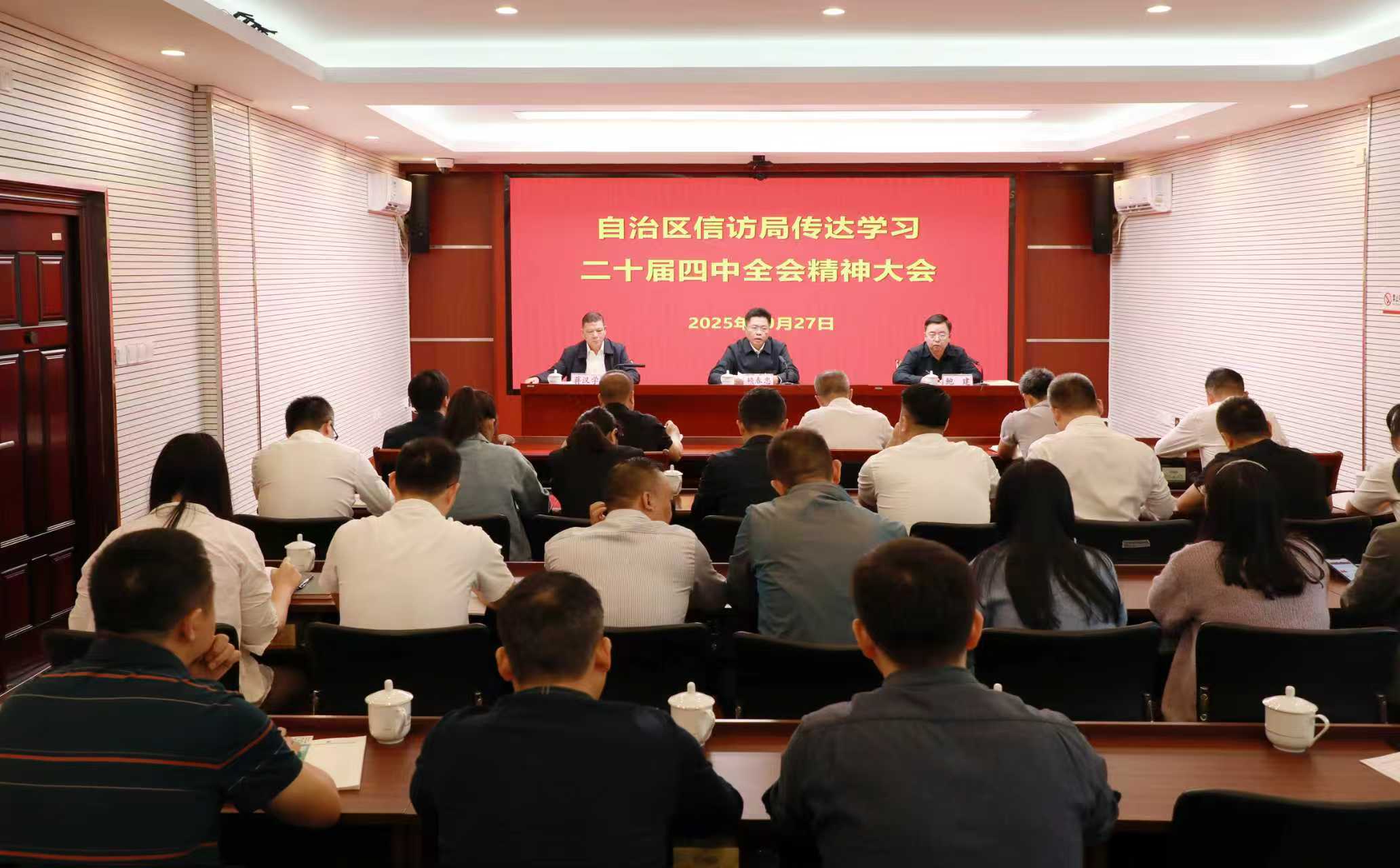 10月27日,自治区信访局召开全体干部职工会议,专题传达学习党的二十届四中全会精神,就贯彻落实工作进行了部署安排。自治区信访局局长、党组书记,自治区党委社会工作部副部长(兼)赖春忠主持会议并讲话。